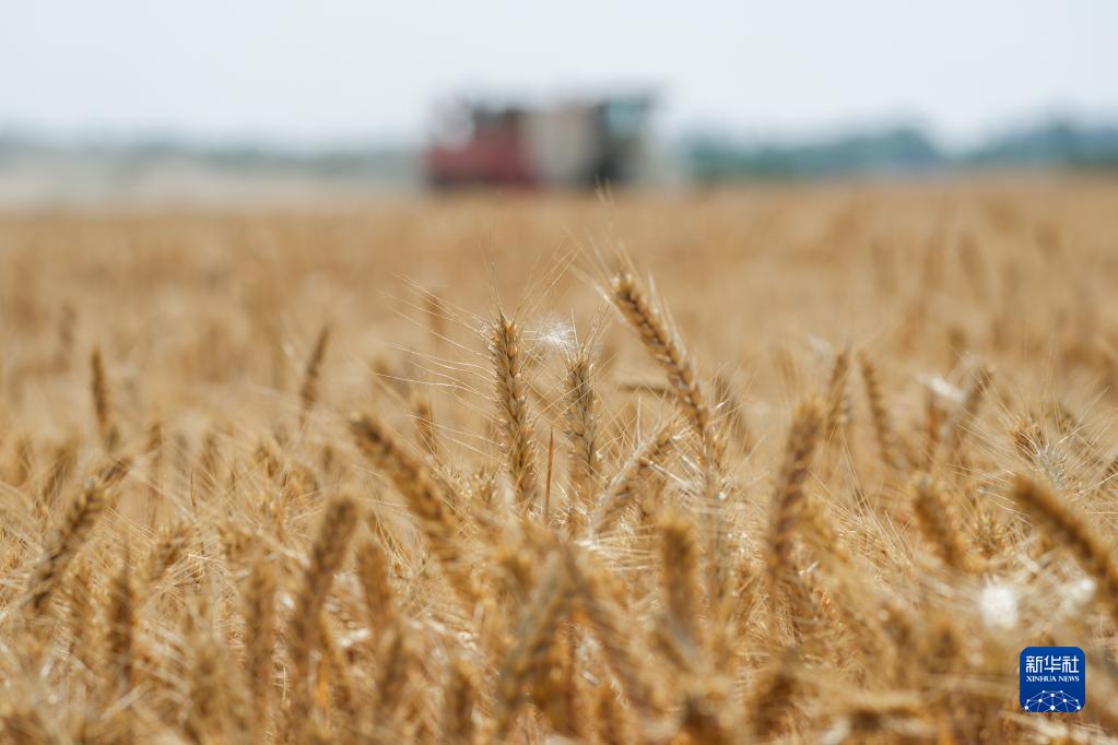 在安徽省亳州市渦陽縣店集鎮(zhèn)宋來寶農(nóng)作物種植專業(yè)合作社,收割機(jī)在麥田中收割小麥(6月7日攝)。新華社記者 杜宇 攝