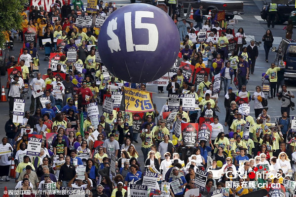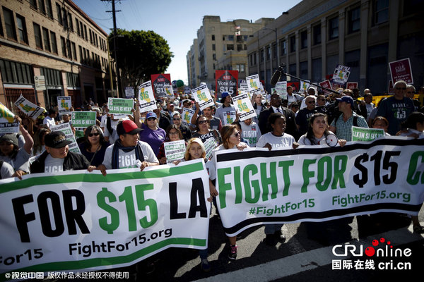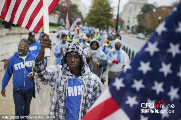當?shù)貢r間2015年11月10日,美國華盛頓,美國工人走上街頭,舉行罷工和抗議活動,要求政府提高最低工資至每小時15美元。圖片來源:視覺中國