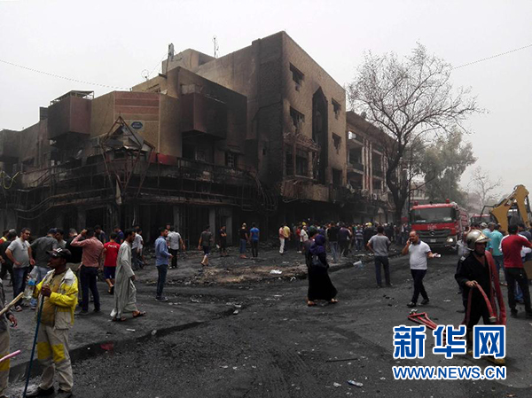 7月3日,在伊拉克首都巴格達(dá)卡拉達(dá)區(qū),人們聚集在爆炸現(xiàn)場。新華社發(fā)(哈利勒·達(dá)烏德攝)