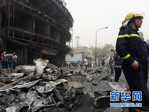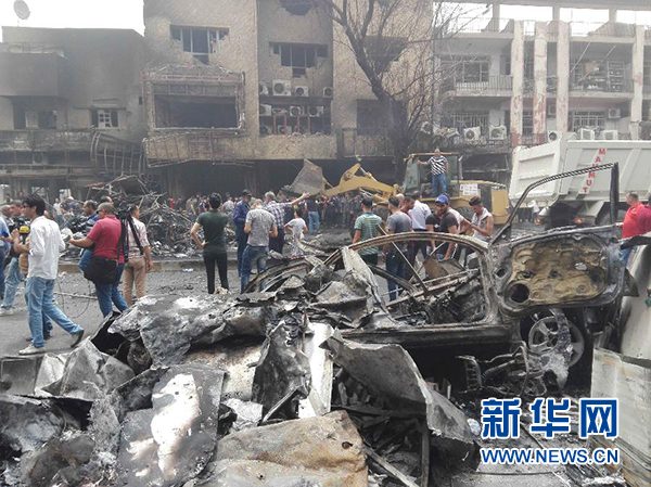 這是7月3日在伊拉克首都巴格達(dá)卡拉達(dá)區(qū)拍攝的被炸毀的車輛和建筑。新華社發(fā)(哈利勒·達(dá)烏德攝)
