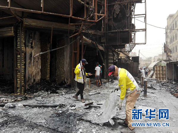 7月3日,在伊拉克首都巴格達(dá)卡拉達(dá)區(qū),工作人員清理爆炸現(xiàn)場。新華社發(fā)(哈利勒·達(dá)烏德攝)