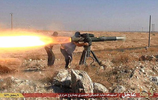 2015年6月26日上傳互聯(lián)網(wǎng)的照片顯示“伊斯蘭國”武裝人員在敘利亞北部的戰(zhàn)斗中向目標(biāo)發(fā)射反坦克導(dǎo)彈。(圖片來源:新華/美聯(lián))