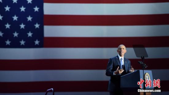 當(dāng)?shù)貢r間1月10日晚,美國總統(tǒng)奧巴馬回到他政治生涯的起點芝加哥,發(fā)表總統(tǒng)任期告別演說。他重提8年前競選時的口號“改變”,呼吁美國人相信通過自身努力尋求“改變”的能力,強(qiáng)調(diào)他對美國的前景更加樂觀。圖為奧巴馬發(fā)表演說。中新社記者 張蔚然 攝