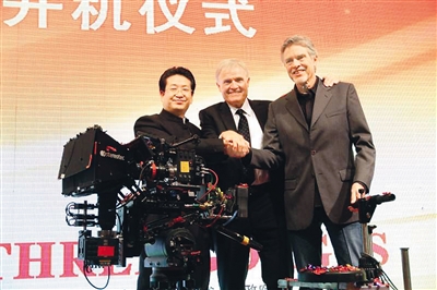 楊書華(左)與“好萊塢3D之父”、《阿凡達(dá)》特效總監(jiān)恰克·科米斯奇(右)及兩度奧斯卡獎(jiǎng)得主、紀(jì)錄片《黃石公園》《大峽谷》導(dǎo)演凱斯·梅林(中),在3D紀(jì)錄電影《新三峽》開機(jī)儀式上。 |