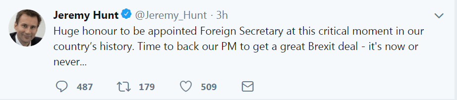 亨特獲得任命后在推特上說(shuō):“非常榮幸能夠在這個(gè)國(guó)家歷史上的關(guān)鍵時(shí)刻被任命為外交大臣。是時(shí)候支持我們的首相達(dá)成一個(gè)好的脫歐協(xié)議了,機(jī)不可失……”