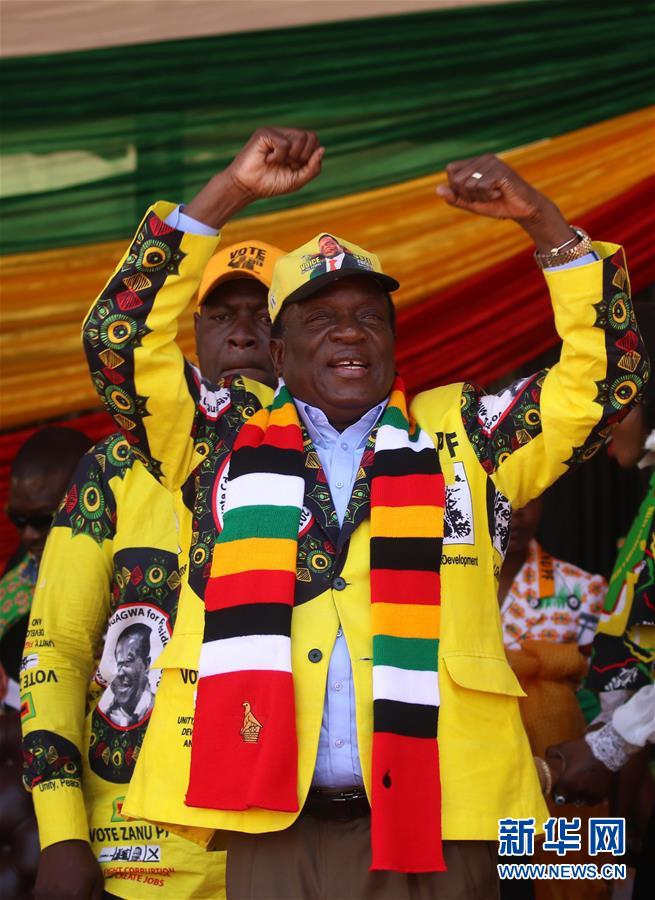 津巴布韋選舉委員會(huì)當(dāng)?shù)貢r(shí)間8月3日凌晨宣布,現(xiàn)任總統(tǒng)埃默森·姆南加古瓦在7月30日的總統(tǒng)選舉中獲勝。 這是姆南加古瓦(前)在首都哈拉雷出席競(jìng)選集會(huì)的資料照片(7月28日攝)。 新華社發(fā)(肖恩·朱薩攝)