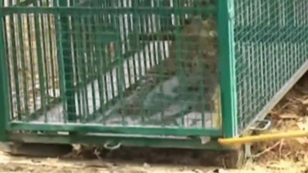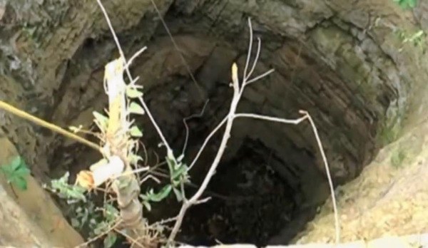 村民們用繩子套住獵豹的尾巴,齊心將其從井底拉上來。