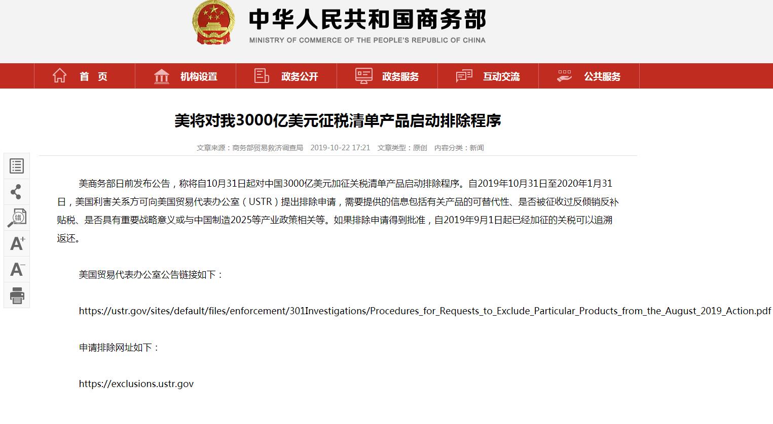 據(jù)商務(wù)部網(wǎng)站消息,美商務(wù)部日前發(fā)布公告,稱將自10月31日起對(duì)中國3000億美元加征關(guān)稅清單產(chǎn)品啟動(dòng)排除程序。自2019年10月31日至2020年1月31日,美國利害關(guān)系方可向美國貿(mào)易代表辦公室(USTR)提出排除申請(qǐng),需要提供的信息包括有關(guān)產(chǎn)品的可替代性、是否被征收過反傾銷反補(bǔ)貼稅、是否具有重要戰(zhàn)略意義或與中國制造2025等產(chǎn)業(yè)政策相關(guān)等。如果排除申請(qǐng)得到批準(zhǔn),自2019年9月1日起已經(jīng)加征的關(guān)稅可以追溯返還。