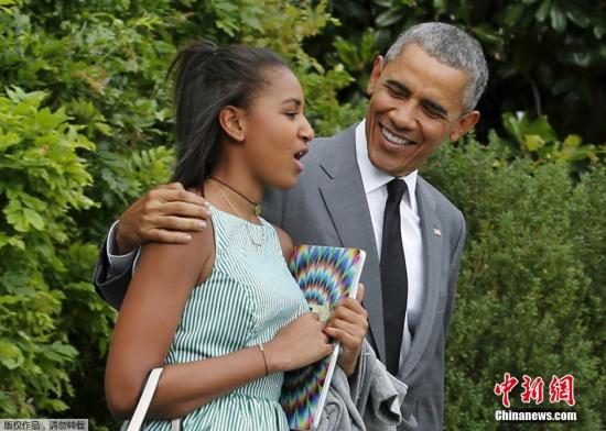 圖為奧巴馬與女兒薩莎。當(dāng)?shù)貢r間2015年7月17日,奧巴馬與女兒薩莎及其兩位朋友登上海軍陸戰(zhàn)隊一號前往紐約度周末。