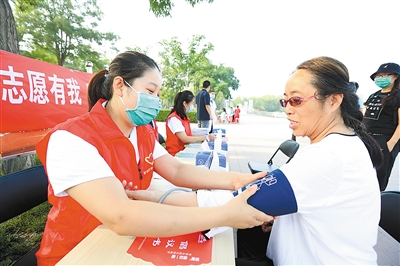 河北中石油中心醫(yī)院青年志愿者在市文化公園為市民測量血壓。記者 陳童 攝