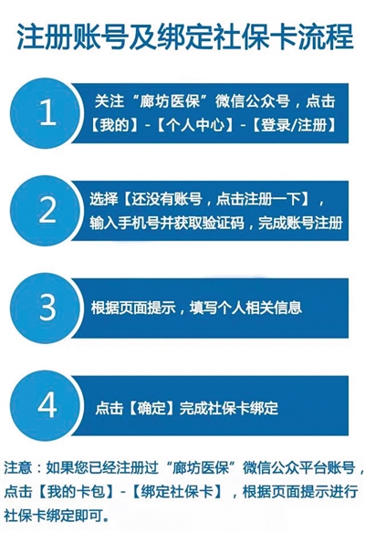 注意:如果您已經(jīng)注冊過“廊坊醫(yī)保”微信公眾平臺賬號,點擊【我的卡包】—【綁定社??ā?,根據(jù)頁面提示進行社??ń壎纯?。