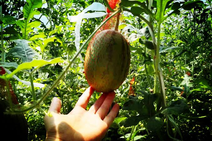 圖為固安縣周家務(wù)村卡爾叔叔幸福農(nóng)場里的麒麟瓜垂掛在藤蔓上。