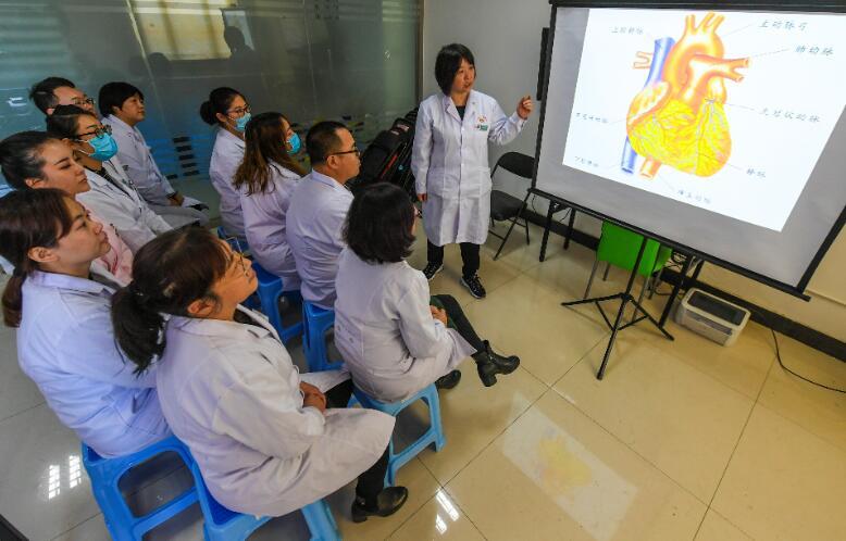 1月8日,在河北省廊坊市廣陽(yáng)區(qū)解放道辦事處社區(qū)衛(wèi)生服務(wù)中心,廣陽(yáng)區(qū)人民醫(yī)院醫(yī)生為社區(qū)醫(yī)護(hù)人員講解醫(yī)療知識(shí)。